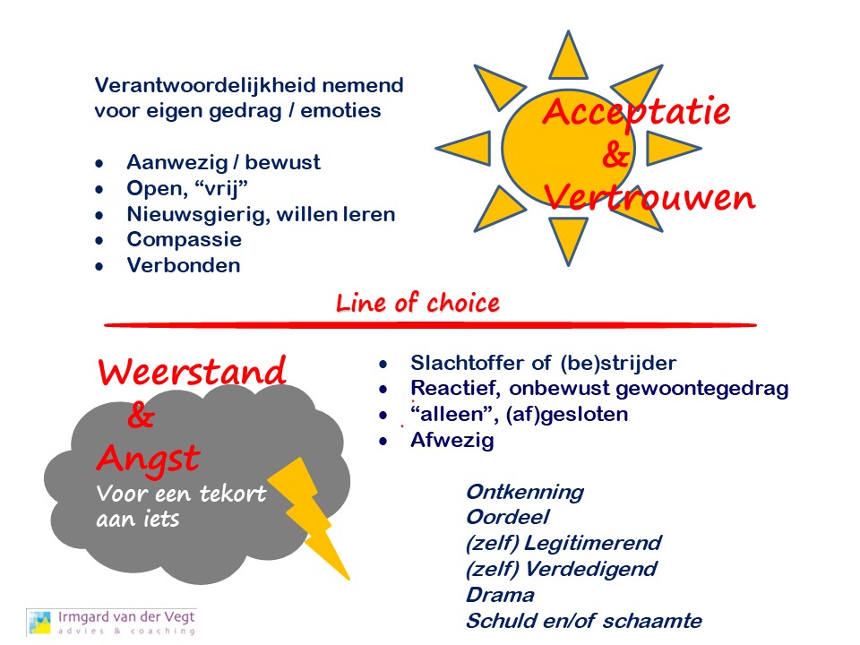 Staat van zijn: Onbewust, reactief, geleid door (onbewuste) angst, in de rol van “slachtoffer” of (be) “strijder”. Onder de lijn zit je als je in meer of mindere mate in je onbewuste reactiepatronen en gewoontegedrag zit. Als je heel eerlijk bent tegen jezelf, herken je kwesties als: